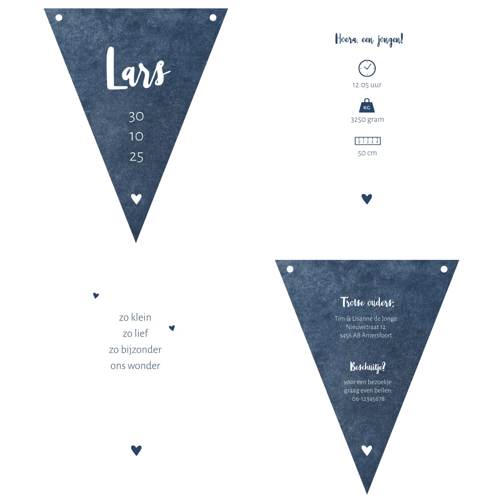 Met dit geboortekaartje voor jongens met vlaggetjes is het geboortekaartje zeker weten uniek. De slingers hebben een donkerblauwe velvet look, afgewisseld met wit. De vlaggenlijn bestaat uit 4 vlaggetjes. De vlaggetjes hebben al boorgaatjes. Je maakt zelf de vlaggetjes aan elkaar met een mooi lintje of touwtje. Deze vind je bij de Extra's. Je hebt voor de 4 vlaggetjes een lijn van 80 cm nodig. Dit unieke geboortekaartje van vlaggetjes verstuur je in een envelop van 12x18 cm. Afmeting per vlag: 14x11 cm.