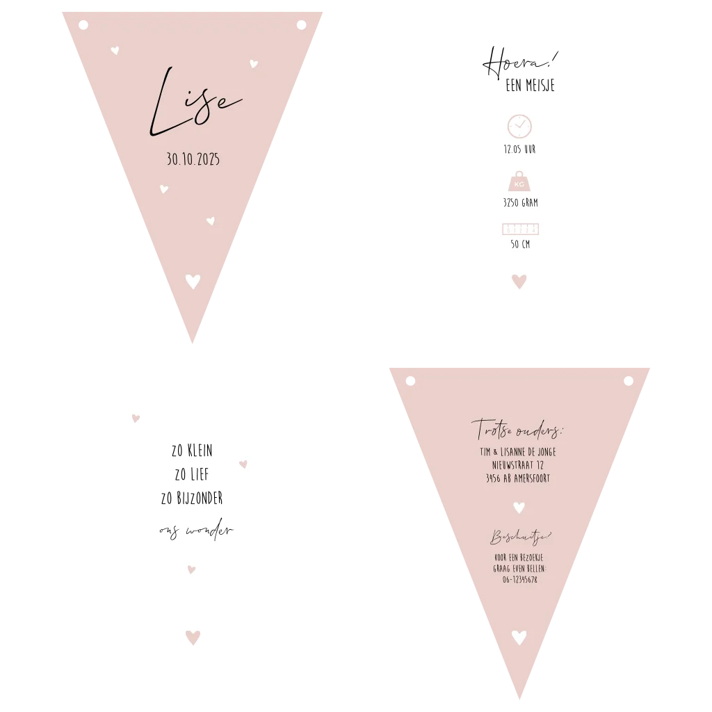 Met deze vlaggetjes geboortekaartjes voor een meisje maak je een feestje van de geboorte van jullie dochter. De roze met witte vlaggetjes hebben boorgaatjes. Maak de vlaggetjes zelf nog aan elkaar vast met een leuk lintje of touwtje. Deze vind je bij extra's. Je hebt voor de 4 vlaggetjes ongeveer 80 cm lint of touw nodig per vlaggenlijn. De vlaggetjes passen in een envelop van 12x18 cm. Afmeting per vlag: 14x11 cm.