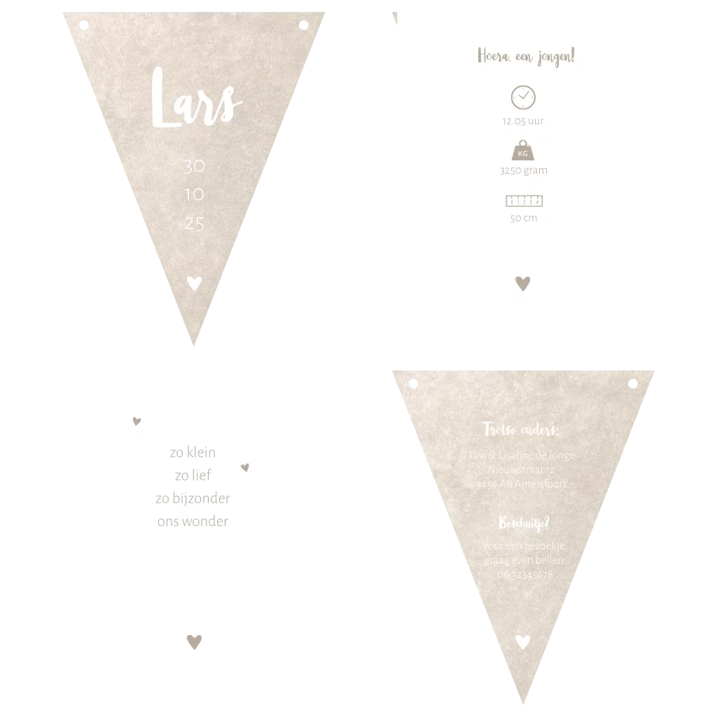 Maak van je geboortekaartje een feestje met een slinger van vlaggetjes! Dit beige neutrale kaartje heeft een velvet look achtergrond. Er zitten boorgaatjes in de vlaggetjes, je hoeft deze dus niet zelf erin te maken. Maak de vlaggetjes aan elkaar vast met bijvoorbeeld een mooi touwtje of lint, deze vind je op de pagina Extra's. Voor een vlaggenlijn met 4 vlaggetjes heb je ongeveer 80 cm touw/lint per vlaggenlijn nodig om de slinger mooi op te kunnen hangen. Je moet de vlaggetjeskaarten zelf nog in elkaar zetten. Kies voor een envelop van 12x18 cm om de vlaggetjeskaarten in te versturen. Afmeting per vlag: 14x11 cm.