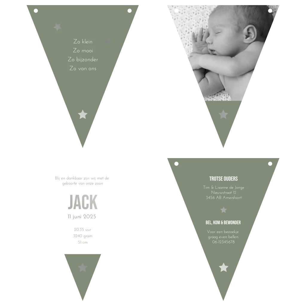 Maak van je geboortekaartje een feestje met een slinger van vlaggetjes! Zo heb je gegarandeerd een uniek geboortekaartje! Dit kaartje is afgewerkt met zilverfolie. Vervang de foto door een foto van jullie kleintje. Er zitten boorgaatjes in de vlaggetjes, je hoeft deze dus niet zelf erin te maken.Maak de vlaggetjes aan elkaar vast met bijvoorbeeld een mooi touwtje of lint, deze vind je op de pagina Extra's. Voor een vlaggenlijn met 4 vlaggetjes heb je ongeveer 80 cm touw/lint per vlaggenlijn nodig om de slinger mooi op te kunnen hangen. Je moet de vlaggetjeskaarten zelf nog in elkaar zetten. Kies voor een envelop van 12x18 cm om de vlaggetjeskaarten in te versturen. Afmeting per vlag: 14x11 cm.